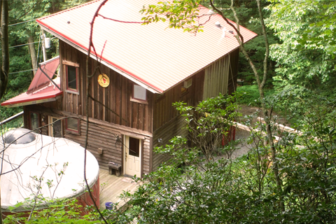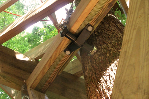 World Treehouses incorporated recycled materials into this Brevard treehouse, including reclaimed siding lumber, windows and metal roof.