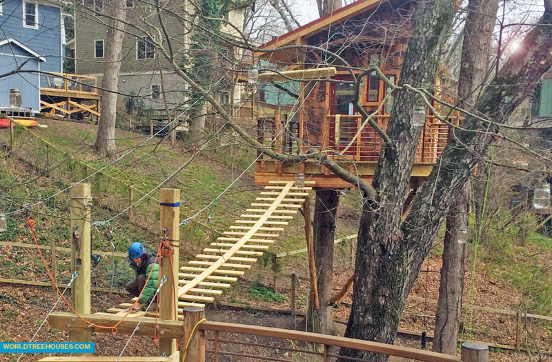 Our lead designer, Micheal Stam, works on the custom-designed suspension bridge for our recently completed downtown Asheville treehouse.