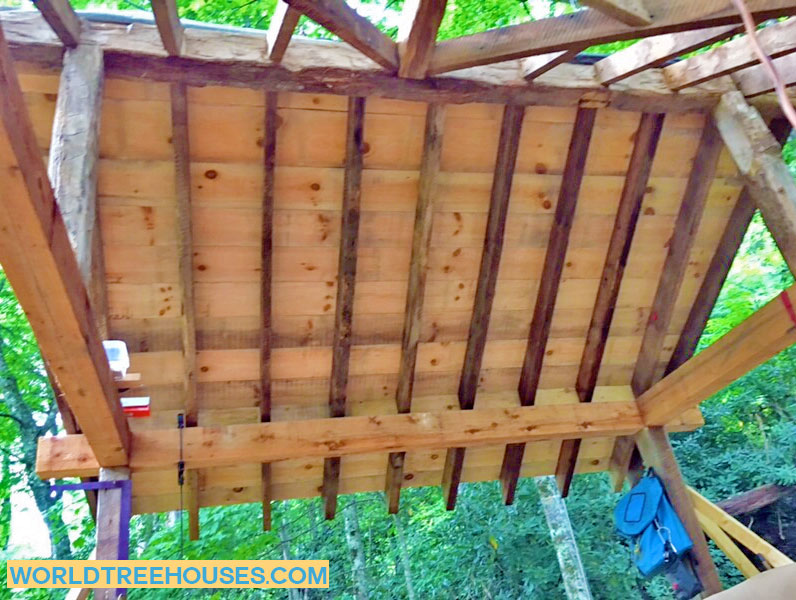 The roof is going up on our Panthertown project, a new WNC treehouse! All the rafters and the ridge beam are recycled barn wood.