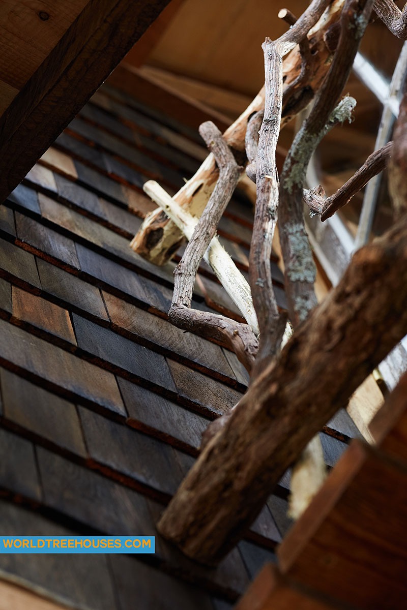 The mountain laurel branches in this railing on the upper floor of our latest WNC treehouse are one of the many custom touches that fill this two-story structure. For this treehouse, we crafted the interior and exterior with beautiful details offered by the generous forest surrounding it. From these laurel branches to locust and maple from the land, this “masterpiece in the trees” is almost more tree than it is house, enhancing the experience of escape into nature.
