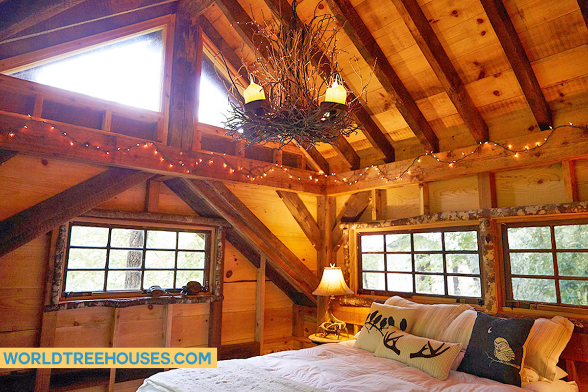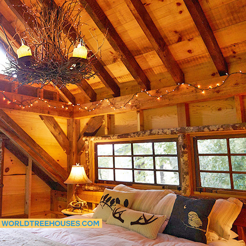 The cozy upper floor of a recent WorldTreehouses tree house twinkles, not only with the lights and lamps strung throughout, but also with the clear light pouring through the branches into this upper floor bedroom!