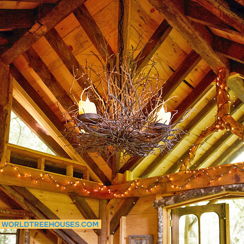 Asheville Treehouse Builder: Panthertown Treehouse: All lit up with hanging twig chandelier.