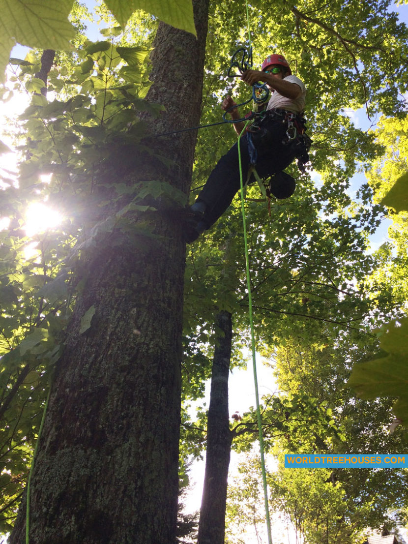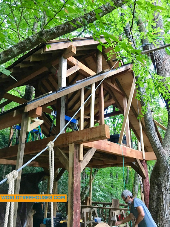 NC treehouse builders: Framing Panthertown Treehouse Last month, our team of NC treehouse builders framed a new treehouse in the Panthertown wilderness area of western North Carolina, near Cashiers. This treehouse is unique in many ways, including its remote location, it’s height from the ground (the second floor is 40 feet up!) and the use of mostly recycled barnwood and trees and branches from the heavily forested property in its construction. Stay tuned for more photos of this exciting project! >View photos of our recently completed downtown Asheville treehouse. The mountains of North Carolina are a perfect place for your treehouse. >Learn about our process for building a project. World Treehouses is an Asheville-based builder of treehouses, tree platforms, rope and suspension bridges, and other tree-centered projects. Want a tree house in the Asheville NC area or beyond? Get in touch.